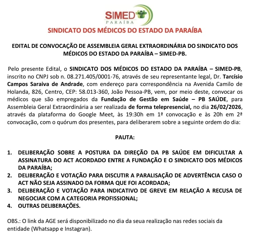 SIMED-PB convoca médicos da PB Saúde para Assembleia Geral Extraordinária